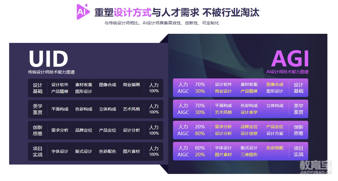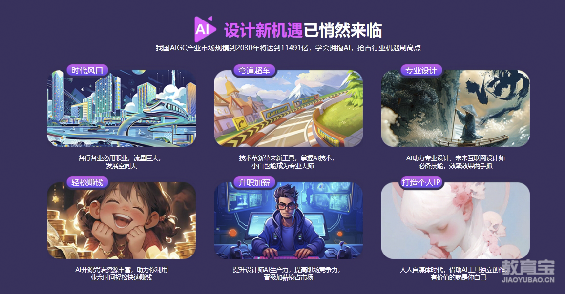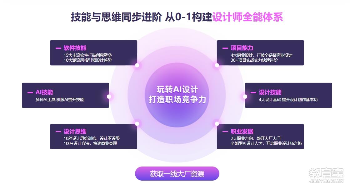 适合未来希望从事商业设计岗位的学员,从零到一系统性学习AI人工智能技术与设计知识。通过AI人工智能的加持,在设计领域辅助学员完成超出想象力的商业设计解决方案,并实现职业上的突破与晋升